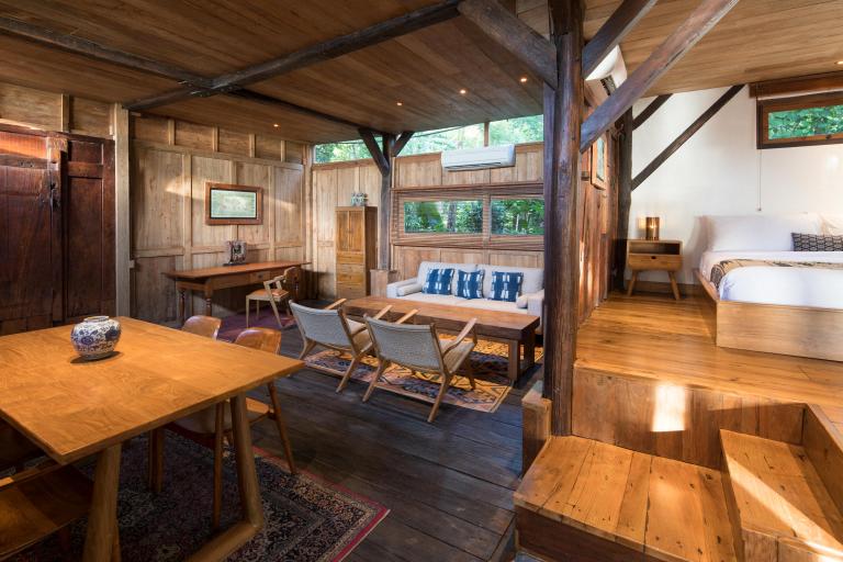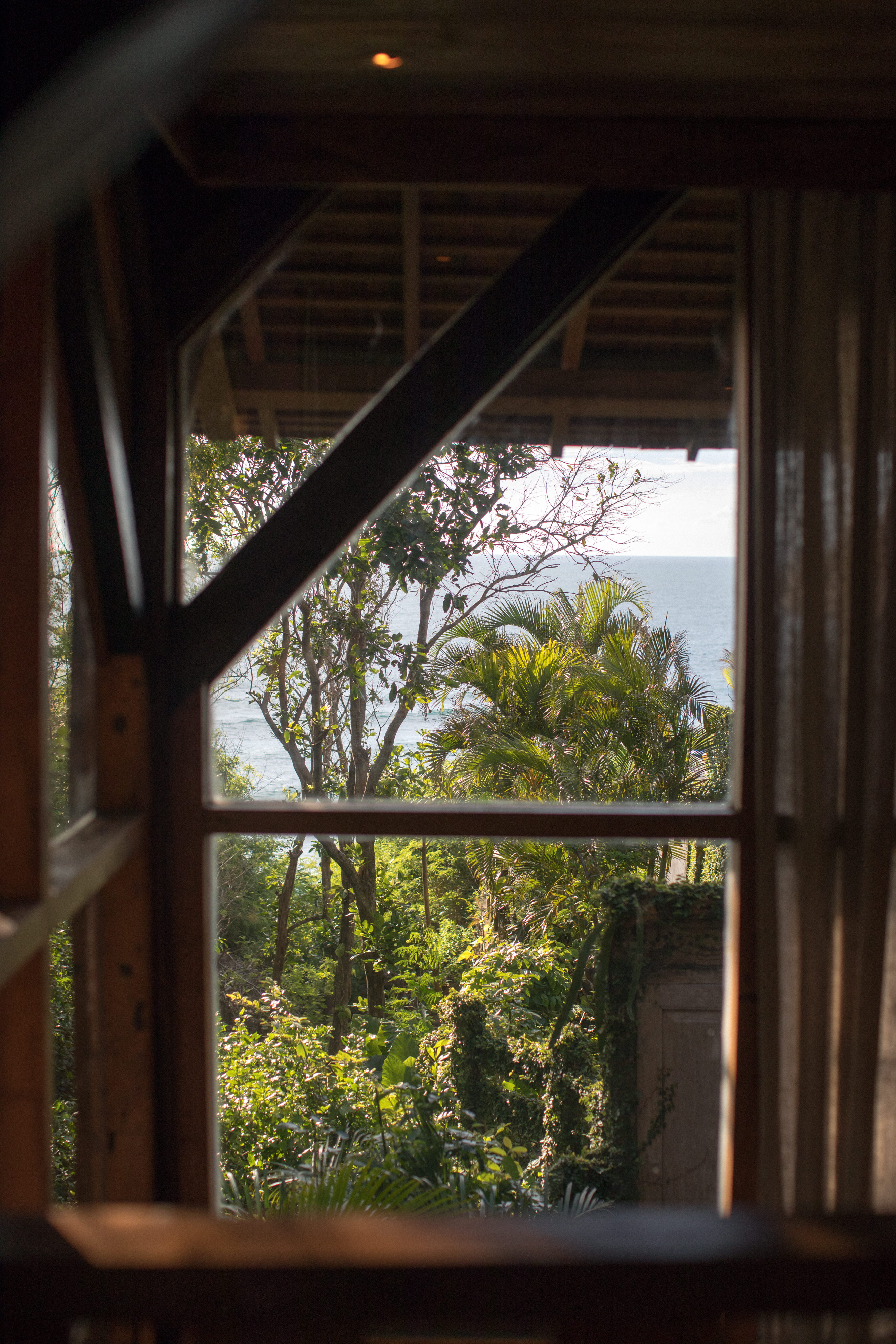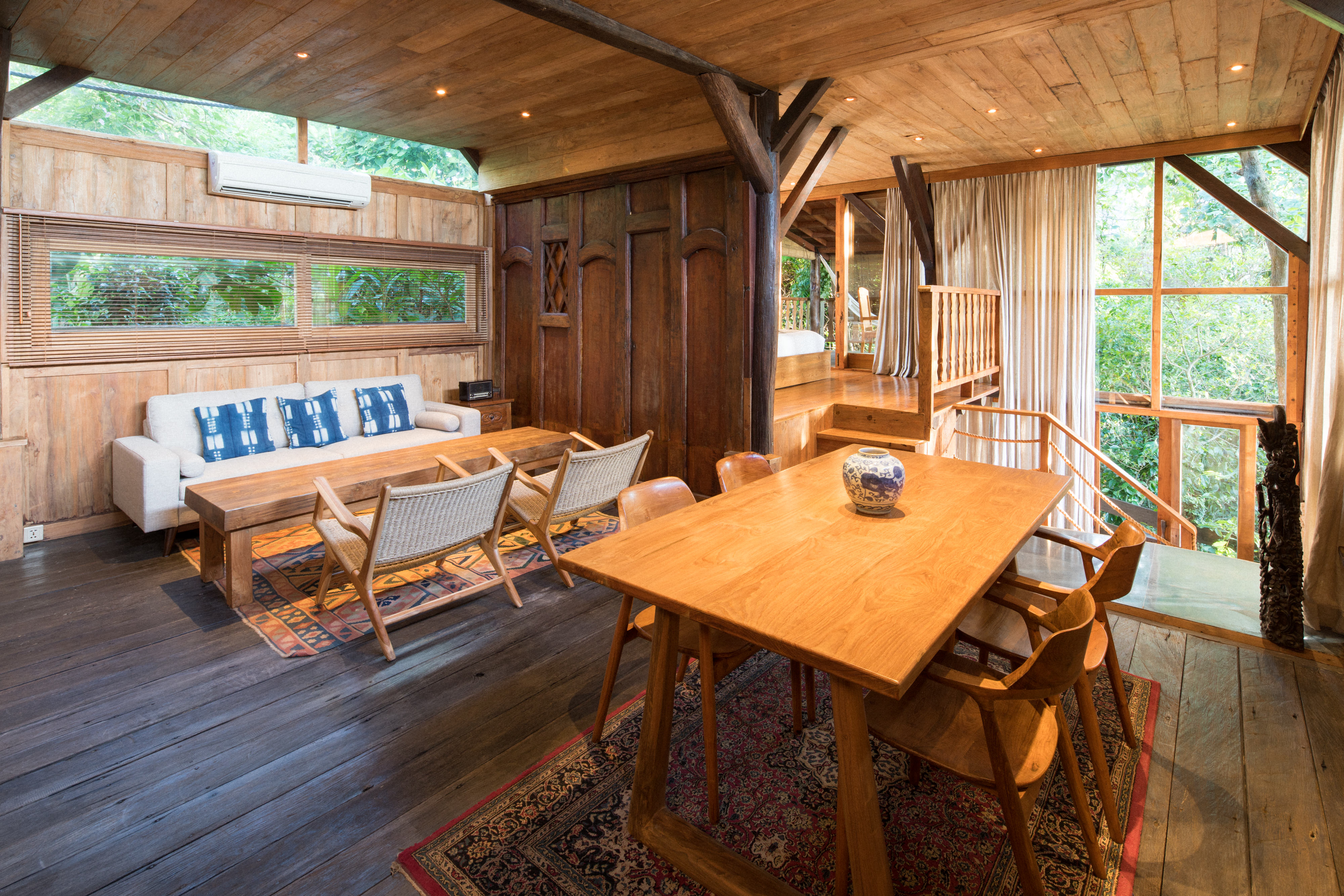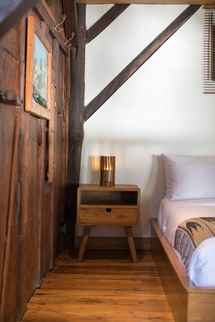 This one bedroom loft is located directly under the Morning Light Yoga Studio. It’s a secluded, reclaimed hardwood two story apartment that fuses lush forest and an ocean view. It’s a perfect getaway for one or two people, and great for guests planning to attend our daily yoga classes. The loft features a shaded upper deck built from reclaimed teak and ironwood where you can take in the ocean breeze.