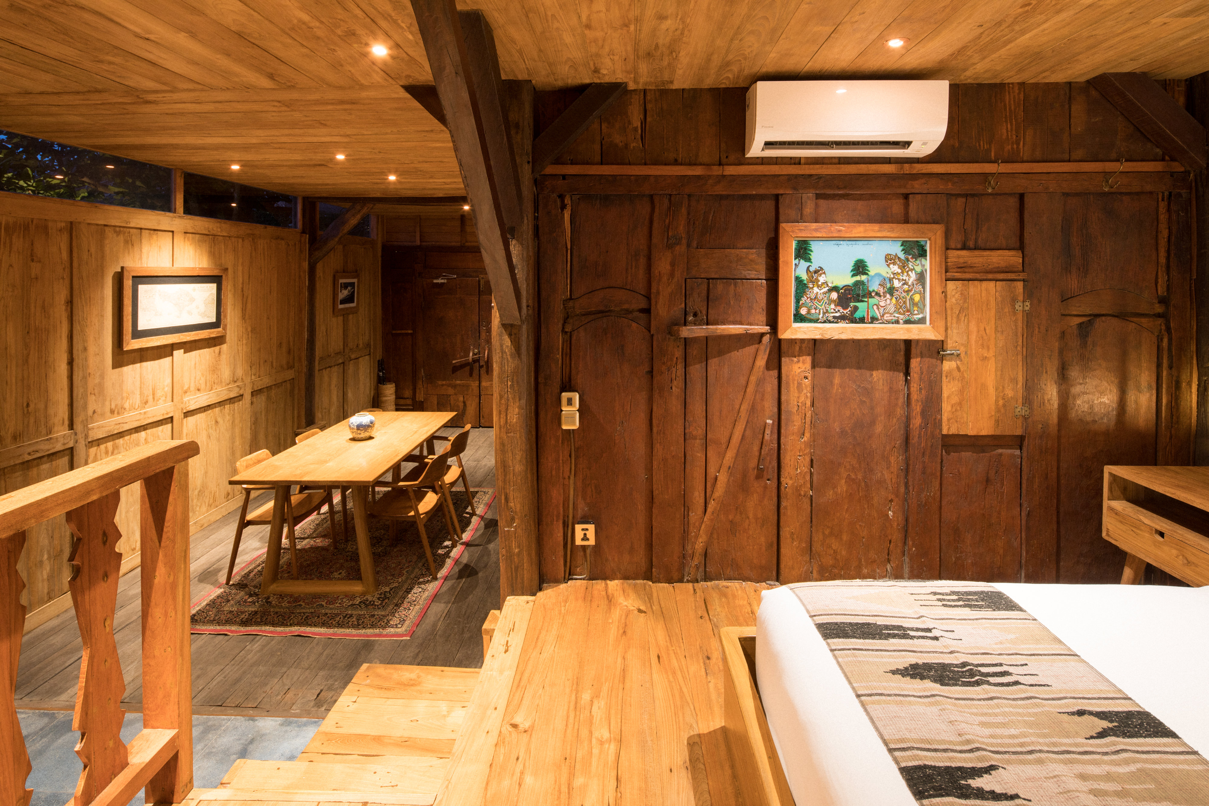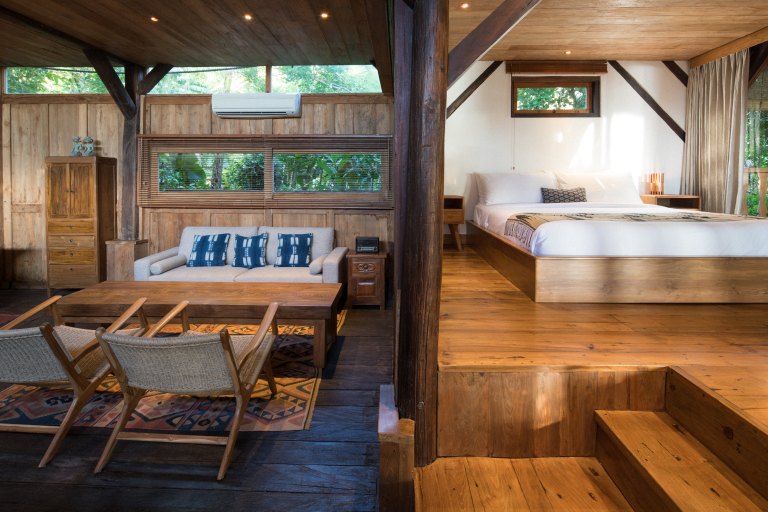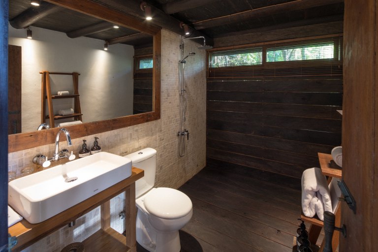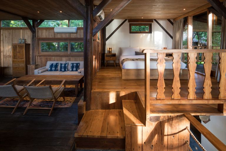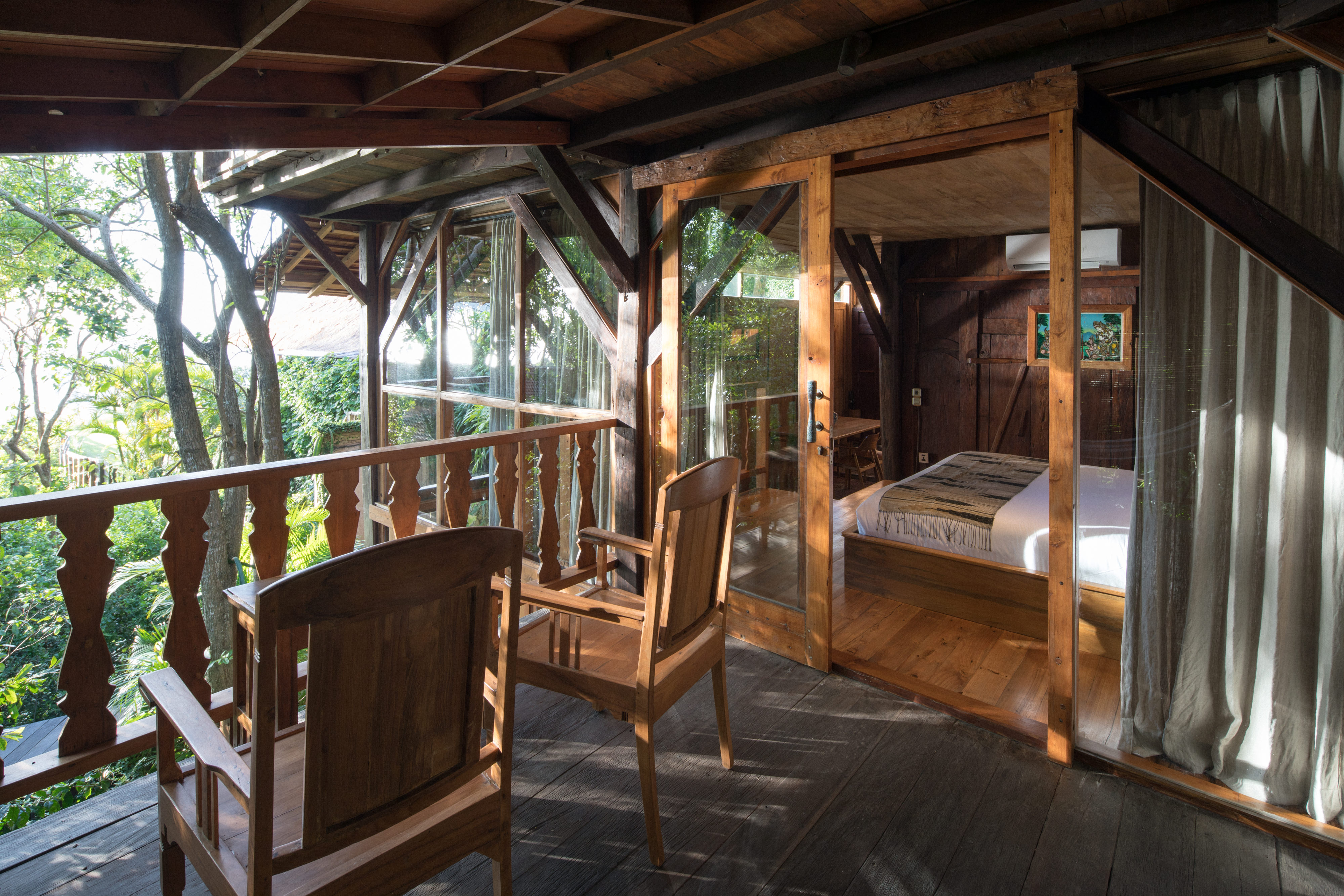 This one bedroom loft is located directly under the Morning Light Yoga Studio. It’s a secluded, reclaimed hardwood two story apartment that fuses lush forest and an ocean view. It’s a perfect getaway for one or two people, and great for guests planning to attend our daily yoga classes. The loft features a shaded upper deck built from reclaimed teak and ironwood where you can take in the ocean breeze.