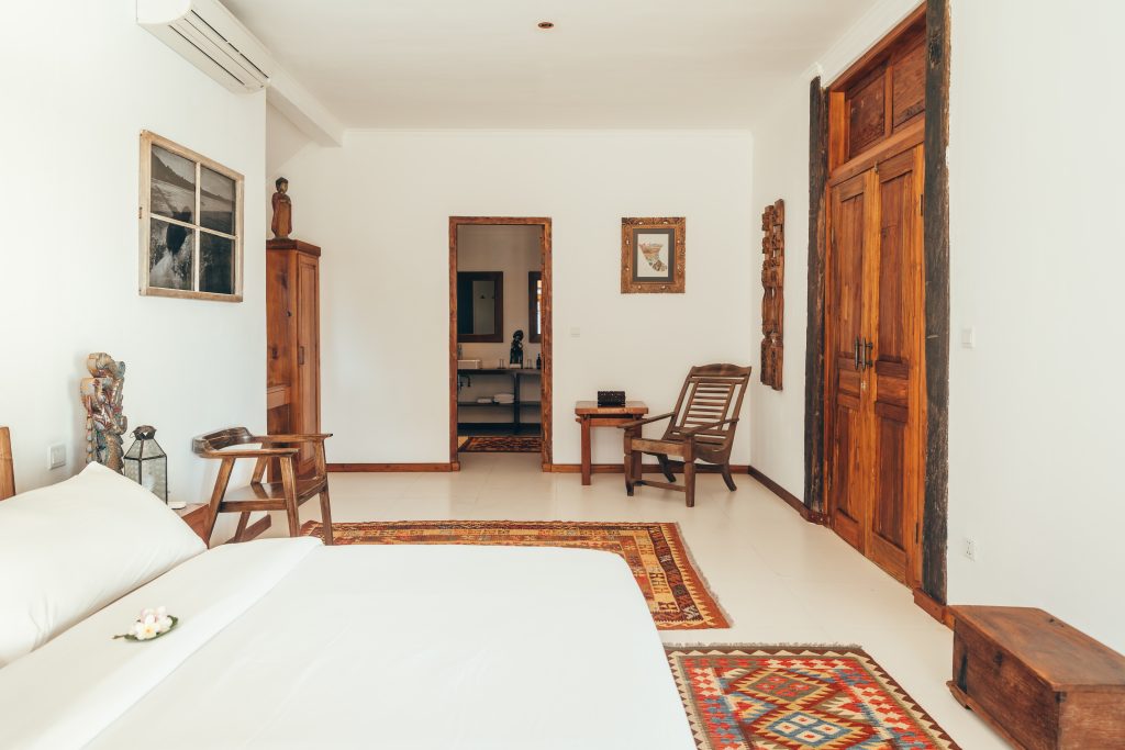 The master bedroom has a king bed and en-suite bathroom. The two guest bedrooms, the oceanfront king and a back guest twinroom, each have an en-suite bathroom as well. The living area is an open plan with a full kitchen and dining table for six guests, and a lounge with sofas. The sliding doors open to the terrace and guarantee ocean breeze ventilation throughout. Outside is a salt water swimming pool and an open “bale” (thatched pavilion). On the covered terrace and in the bale are deck chairs, lounges, for all your outdoor living needs.