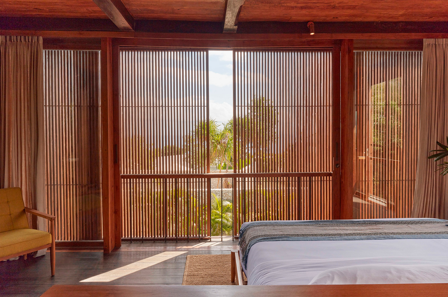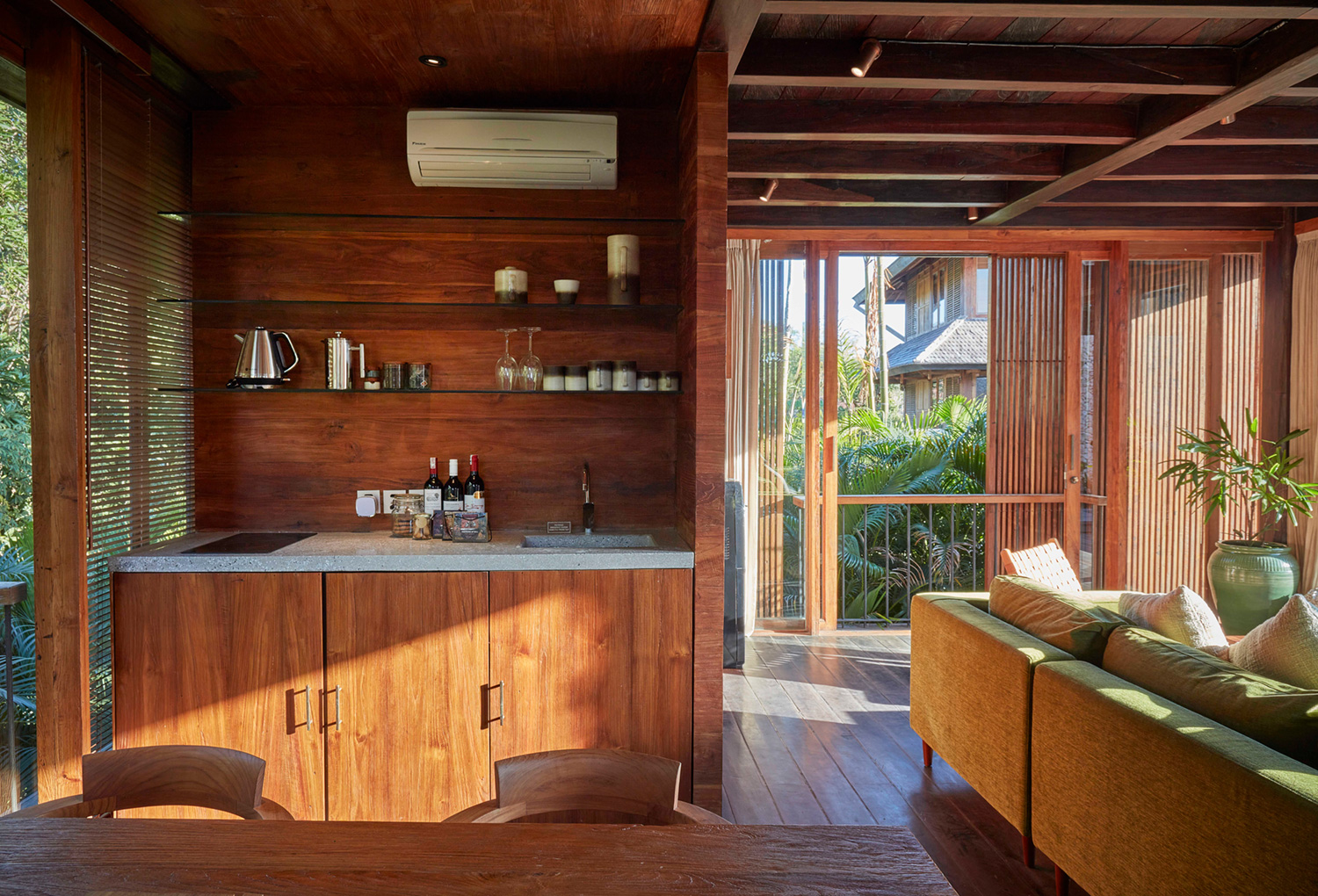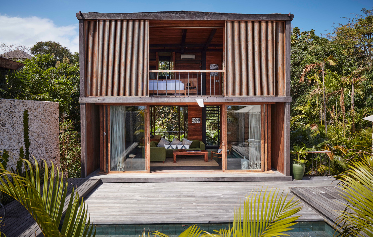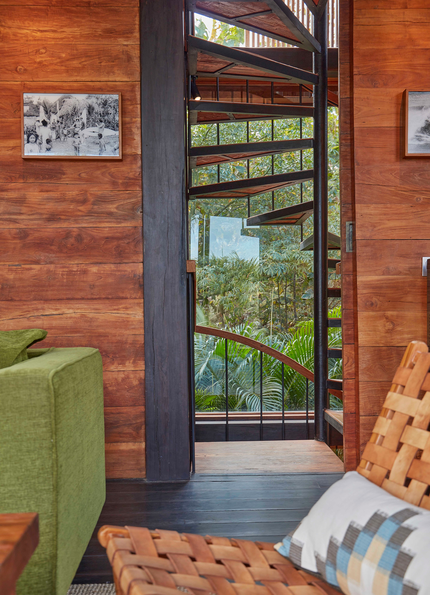 This two bedroom tropical modern villa is a three story tower with ocean and jungle views. This upright stretched cube is completely skinned with vertical slatted reclaimed Javanese teak and transforms into an open-air environment with floor to ceiling sliding walls that free the space on all four sides of the structure. A spiral staircase connects all floors.