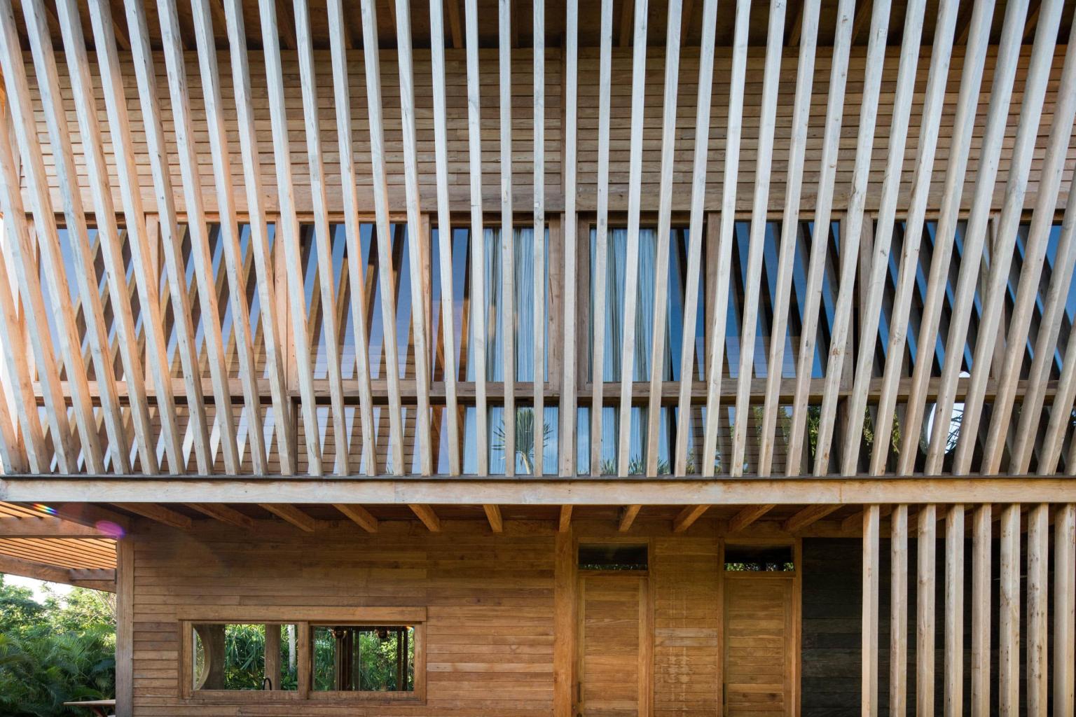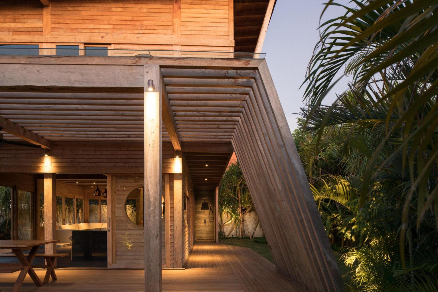 One ample building houses the living area and kitchen on the ground floor with two bedrooms above. On the outside of the building, wooden slatting both shades and enhances the sun. On the upper floor, two private bedrooms each with a king bed overlook the green, with plenty of natural light. The top deck is the perfect place to soak in the salt breeze. The lower level living area with provides couches a dining area with a complete kitchen with custom copper fixtures, marble countertops, and a bar with seating. The ground level opens up to a large deck and lawn area with round saltwater plunge pool.