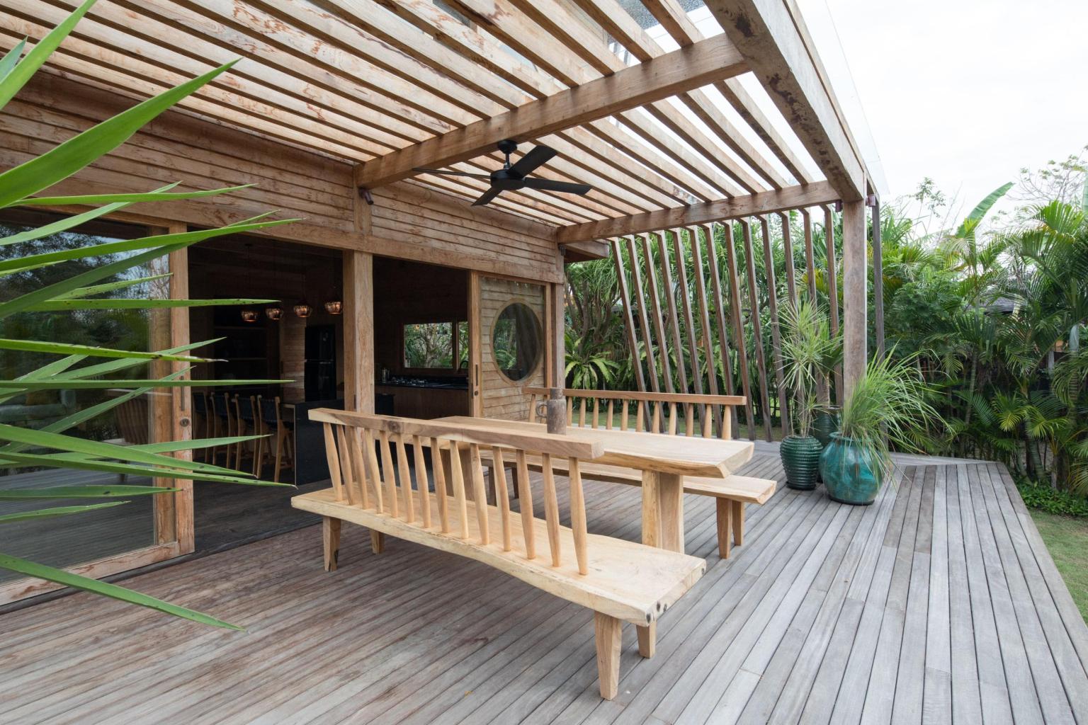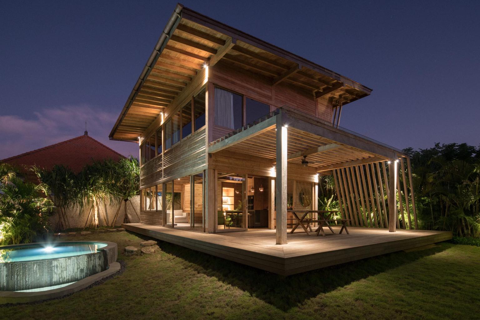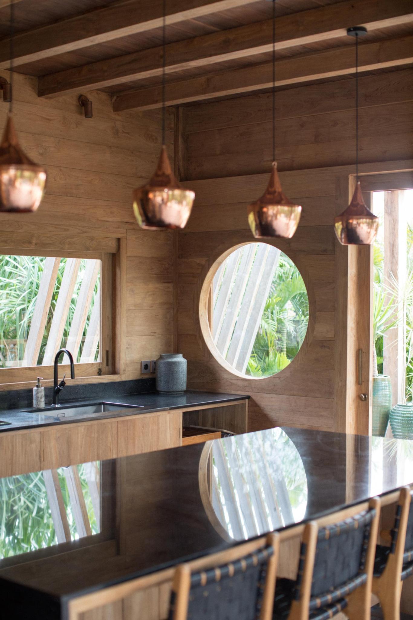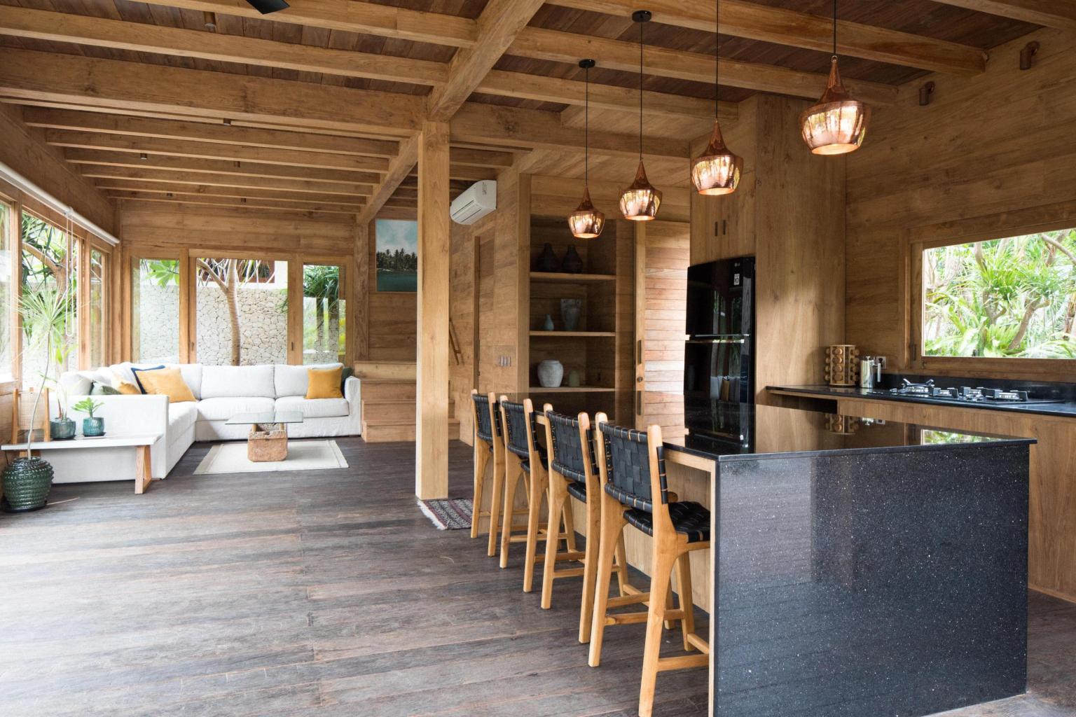 Constructed of reclaimed teak and ironwood without any concrete or steel visible in the structure, this two bedroom villa is both an architectural masterpiece and a delightful sanctuary. With plenty of charm and character, it overlooks the lush garden through its large glass doors and unique round windows. You’ll feel both at home and inspired.